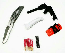 В нем собран самый минимум инструментов для эффективного выживания – как по размерам, так и по универсальности. Спички и отдельно чиркалка для них, хлопковые шарики для растопки и огниво – и у вас всегда есть огонь. Шнурок, свисток и нож помогут отпугнуть зверя, добыть пищу и обустроить ночлег.