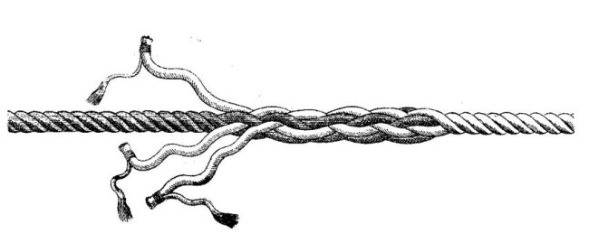 Пробивка прядей производится по правилу: «через одну под одну против спуска троса». При выполнении пробивки каждая прядь первого троса проводится над ближайшей прядью второго троса и пробивается с помощью свайки под следующую его прядь (рис. 4 и 5). Таким же образом выполняются вторая и третья пробивки прядей первого троса. В процессе работы пряди обтягиваются и поколачиваются мушкелем. После пробивки прядей первого троса с него снимается временная марка и под его пряди пробиваются пряди второго троса, причем для постепенного уменьшения толщины сплесня третья пробивка выполняется прядями, из которых вырезана половина каболок (рис. 6). Законченный сплесень показан на рис. 7. Для увеличения срока службы сплесня он подвергается клетневанию. Клетень накладывается по направлению от концов сплесня к его середине, однако средняя часть сплесня не клетнюется во избежание отсыревания троса. Короткий сплесень имеет большую прочность, чем другие виды сплесней, употребляемых при сращивании тросов.