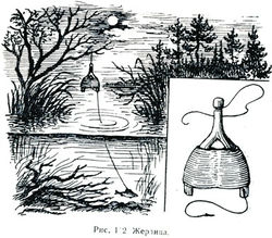 Жерлица ставится таким образом: к верхнему концу шестика посредством мертвой петли привязывается рогулька, с которой бечева несколько спускается и затем защемляется в расколотом рожке. При этом надо наблюдать, чтобы бечева легко спускалась с рогульки. Шест ставится наклонно к воде, и крючок с живцом опускается в воду. Если желают сделать жерлицу незаметной, то шестик кладут совсем на воду. Живца насаживают различно, но всего лучше его пришивать. Опускать живца надо примерно на половину глубины места ловли или ближе ко дну (в мелком месте). За живцами, ходящими на жерлицах, надо иметь наблюдение, чтобы они не запутались в траву, были постоянно видны хищникам, и бойко ходили; вялых п уснувших следует заменять свежими. Для живцов употребляют всякую рыбку, но всего лучше плотва, голавлик, подъязик, пескарь, карась и иногда окунь; всего хуже берет щука на ершей и линьков. Ставят жерлицы преимущественно на ночь и осматривают по утрам. Весной нужно ставить в местах средней глубины и тихих, летом возле трав и коряг, а к глубокой осени в местах открытых и широких. Если жерлица ставится в месте с быстрым течением, то к бечеве надо прикреплять грузило, дабы живцу легче было ходить в глубине. Для постановки жерлицы в местах, густо заросших травами, надо очистить косой прогалинку и вбить в дно кол, к которому привязать под прямым углом шестик в 1,5 м длины; рогулька должна приходиться над серединой очлщен-ной прогалины. При этом необходимо обращать внимание, чтобы жпвец не был пущен слишком свободно; иначе он может запутаться в траву.