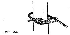На рабочем конце веревки вяжется узел восьмерка. В него встегивается карабин. Рабочий конец вместе с карабином обносится вокруг дерева (выступа рельефа) и карабин встегивается в коренной конец (рис. 28). При нафужении коренного конца узел затягивается. Если потянуть за карабин, при помощи вспомогательной веревки, освободив нагруженный конец, то карабин начнет смещаться вдоль грузовой веревки, а сама грузовая веревка, следуя за карабином, будет продернута.