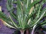 Образует декоративную розетку длинных и узких темно-зеленых листьев.